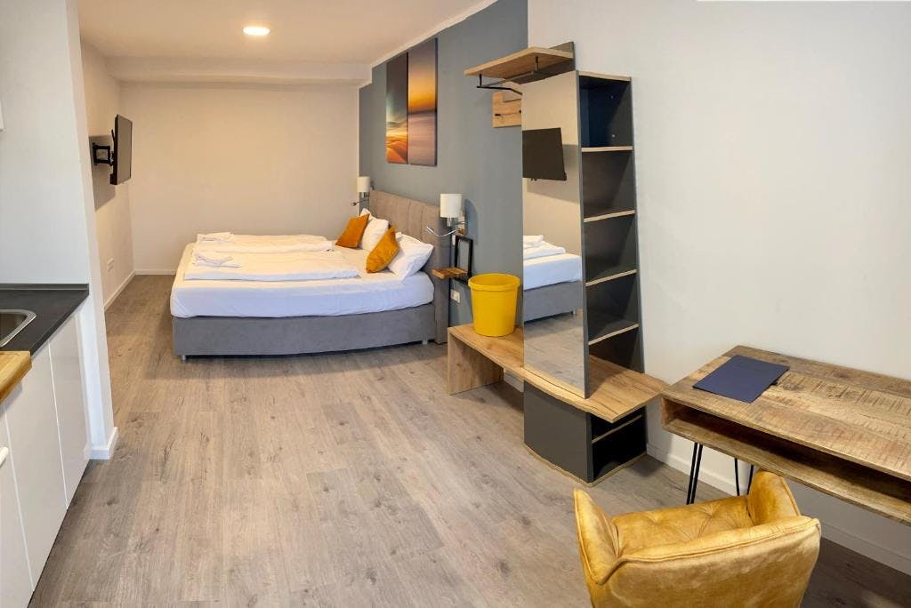 The room is 25 square meters and features a Smart TV (44 inch), free WiFi, and a private bathroom with a shower and free toiletries. A small kitchen equipped with a fridge, a microwave and a stovetop can be used free of charge. Coffee and tea facilities, as well as the kitchen utensils, can also be used free of charge.